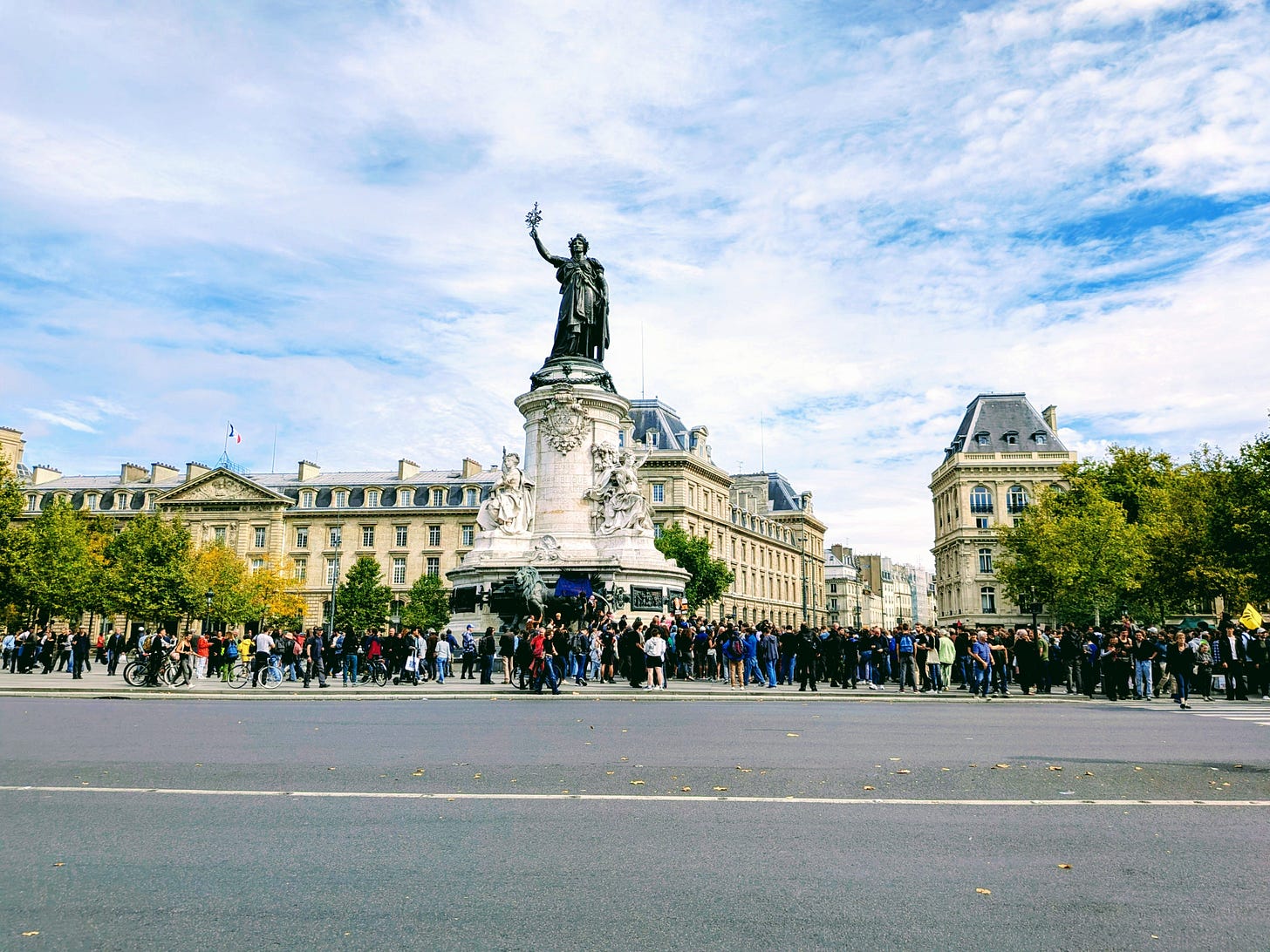 Faced with a months-long political and budgetary standoff that paradoxically pitted the left and far-right together against the center, French citizens across the country were saying that they had had enough. The ambiance in Paris was generally positive, and after lunch I made my way to the Place de Chatelet where a number of disparate groups had gathered. There were Communists, Queer groups, labor organizers and at least one brass band.
